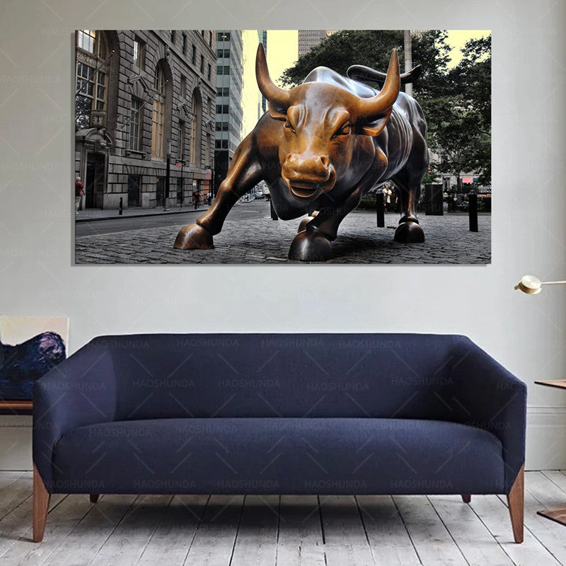 Elevate your space with the iconic Wall St. Charging Bull canvas print—a captivating homage to the spirited essence of New York City. An ideal gift for any occasion, this striking piece by Arturo Di Modica brings the power and energy of the Charging Bull statue directly into your home. Ready to hang without the need for a frame, it effortlessly complements any decor style. With meticulous attention to detail, the canvas captures the essence of the bull's strength and determination, accented with rich copper, green, and stone hues. Whether adorning your living room, office, or den, this masterpiece adds a touch of urban sophistication to any space, making it a must-have for discerning art enthusiasts and admirers of New York City alike.!