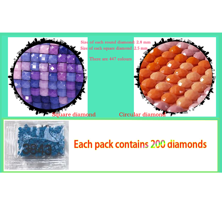 There's a difference between square and round diamonds. Square drill diamonds look a bit "cleaner" than round drill diamonds. They line up more easily and create a "fuller" mosaic look when enjoyed from a distance. Round diamonds seem to stick to the diamond pen better, making the transition seem more seamless. Given the round shape of the diamonds, gaps between diamonds may appear more apparent when you're close up with the painting.